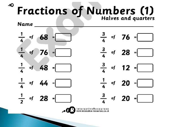YOUR TURN! � Find a seventh of 84. 84 ÷ 7 = 12 � Find a quarter of 96. 96 ÷ 4 = 24 � Find a fifth of 125 ÷ 5 = 5 � Find five-eighths of 88. 88 ÷ 8 = 11 x 5 = 55 � Find three-fifths of 65. 65 ÷ 5 = 13 x 3 = 39 � Find seven-tenths of 100÷ 10=10 x 7=70