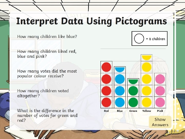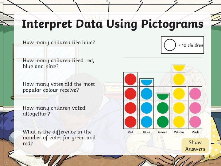 Interpret Data Using Pictograms How many children like blue? 7 = 2 children 21 How many children liked red, blue and pink? How many votes did the most popular colour receive? 9 35 How many children voted altogether? 3 What is the difference in the number of votes for green and red? Hide Show Answers