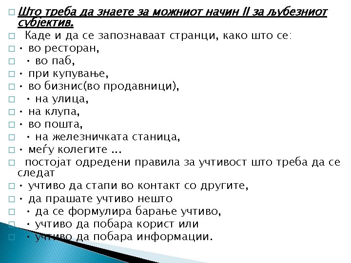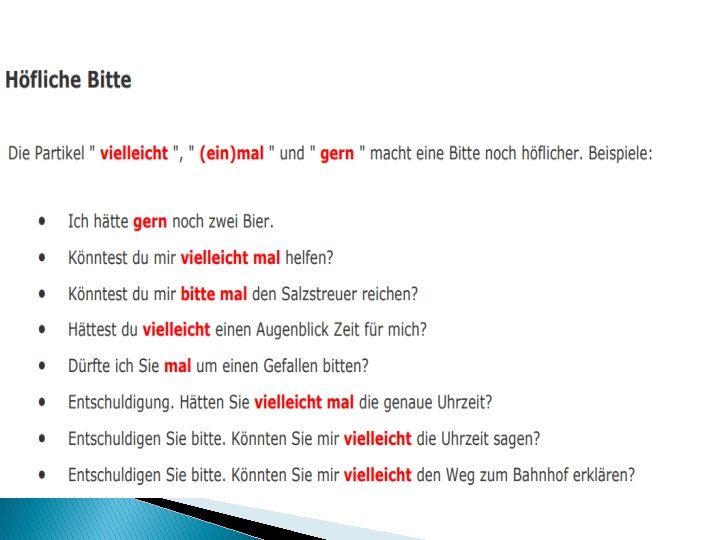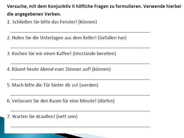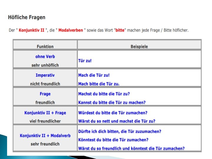 Was man über den Konjunktiv II der Höflichkeit wissen sollte. Überall dort, wo Fremde auf Fremde treffen, wie zum Beispiel: � • im Restaurant, � • in der Kneipe, � • beim Einkaufen, � • im Geschäft, � • auf der Straße, � • auf der Bank, � • auf der Post, � • am Bahnhof, � • unter Arbeitskollegen. . . gibt es bestimmte Höflichkeitsregeln, die man beachten sollte, • um höflich mit anderen in Kontakt zu treten, • um höflich etwas zu fragen, • um höflich eine Bitte zu formulieren, • um höflich um einen Gefallen zu bitten oder • um höflich eine Auskunft zu erfragen. �