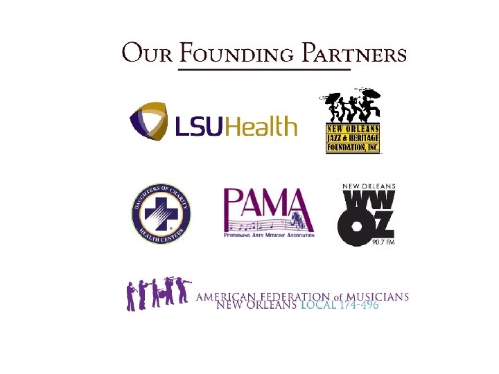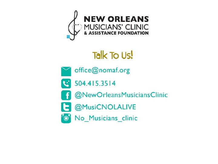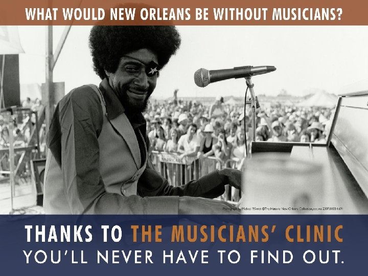 Since May 1998, the New Orleans Musicians’ Clinic, as a federally designated Patient Centered Medical Home, combats these health disparities by providing direct, comprehensive and specialty medical services to more than 2, 500 performing artists and culture bearers.