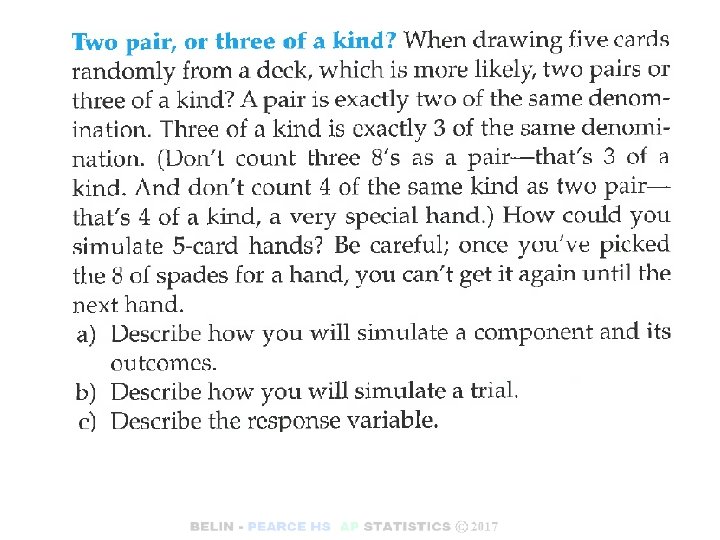 Page 267 #10 – Simulation Simulate drawing five cards and calculating the probability of getting two pair or three of a kind. a) The component is picking ONE single card. An outcome is the suit and denomination of the card. This can be done with the table of random digits: Order the cards in the deck giving every card a number {01 -52}. Select two digits at a time from a random row in the random digit table. Ignore 00, and 53 -99 and numbers that repeat. OR You could go to the table of random digits and select one digit at a time {1, 2, 3, 4} to simulate a Suit and then select two digits at a time {01 -13} to simulate a denomination. Ignoring 0, 5 -9 for suits and 00, 14 -99 for denomination and repeaters. b) A trial is a collection of 5 randomly selected cards. (5 -card hand) c) The response variable is recording whether the hand has two-pair, three of a kind, or neither.