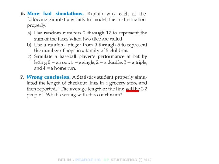 Simulation Steps 1. Assign numbers to model the outcome. 2. Explain how you will simulate the trial. 3. State clearly what the response variable is. 4. Run several trials. Determine when you Stop!. 5. State your conclusion (in the context of the problem, as always).