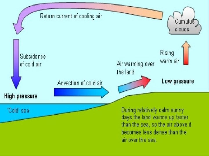Sea Breezes • High pressure is created over the ocean during the day and low pressure over land due to uneven heating • Air moves from the ocean to the land creating a sea