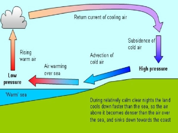 Land Breezes • Low pressure occurs over the ocean during the night and high pressure over land due to the uneven heating of earth • This causes wind to move from the land to the ocean creating a land breeze