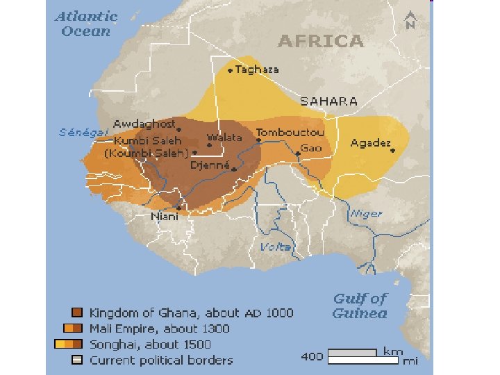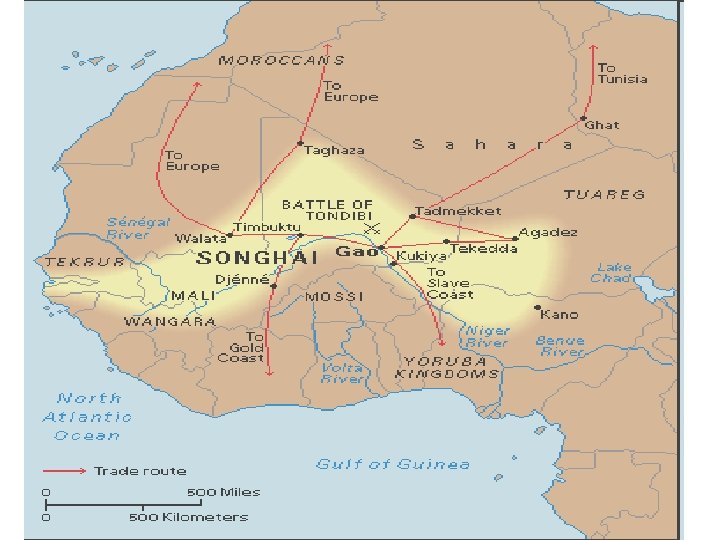• The Destruction of Songhai • The Moroccans’ guns and cannons brought disaster to Songhai. The swords, spears, and bows carried by Songhai’s warriors were no match for firearms. • The Moroccans attacked Timbuktu and Gao, looting and taking over both cities. The Moroccans didn’t push farther into Songhai, but the damage was done. Songhai never recovered from the loss of these cities and the income they produced. • Changes in trade patterns completed Songhai’s fall. Overland trade declined as port cities north and south of the old empire became more important. For example, people who lived south of Songhai began to trade along the Atlantic coast. European traders preferred to sail to Atlantic ports than to deal with Muslim traders. Slowly, the period of great West African empires came to an end.