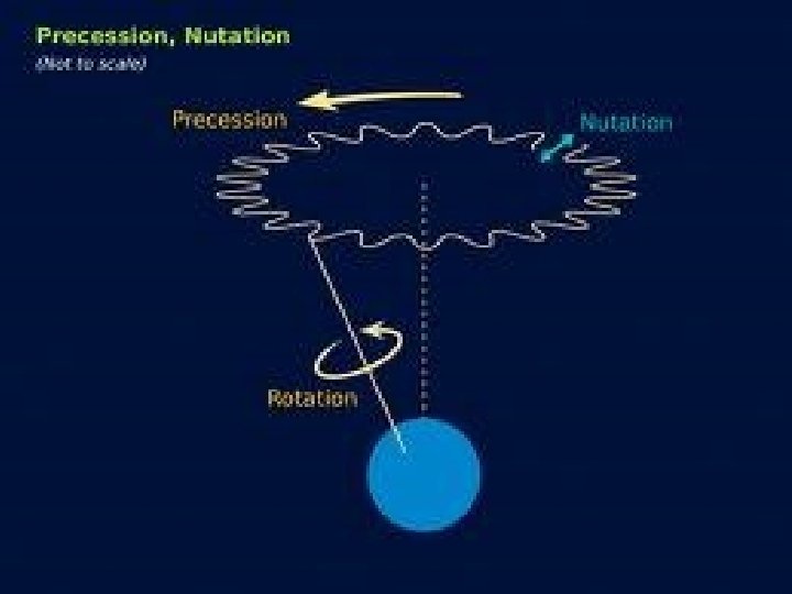 Nutation • Nutation occurs about the precessional axis and looks like a wobble. • Nutation is a change in the tilt of Earth’s axis by ½ degree one way or the other. This causes the tilt to move back and forth from 23 degrees and 24 degrees. • This occurs over an 18 year period. • This is due to gravitational forces of the Moon, the Sun, and other planets. • This causes seasons to be more or less extreme.