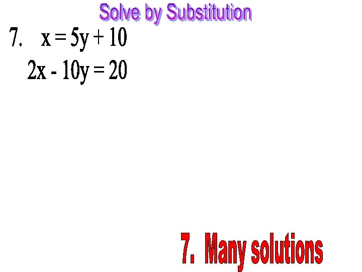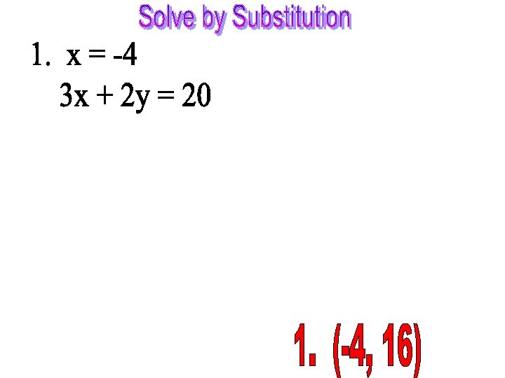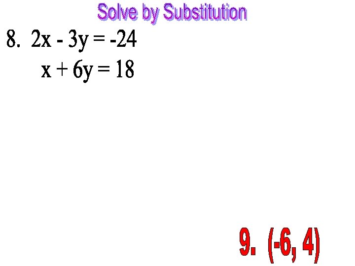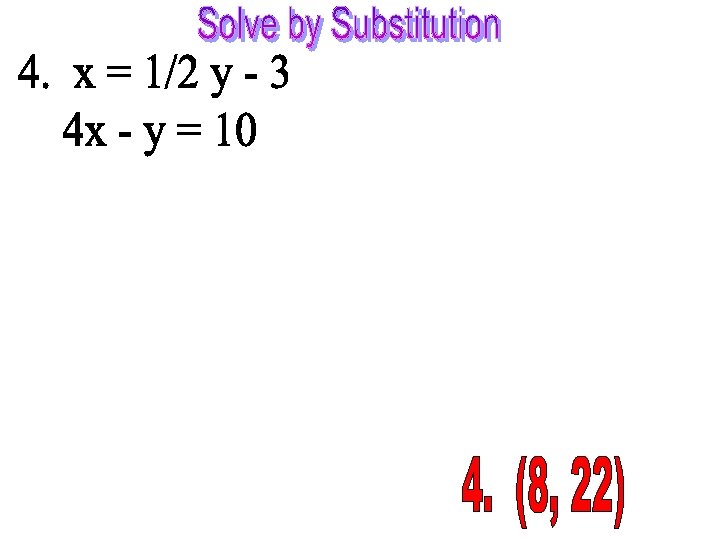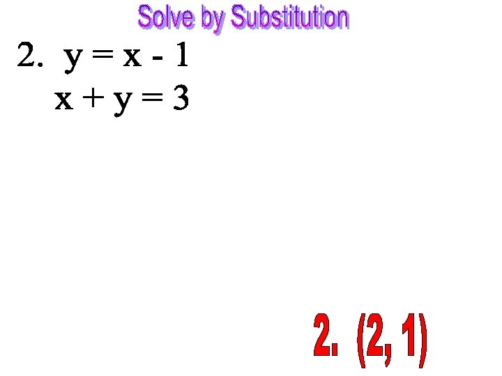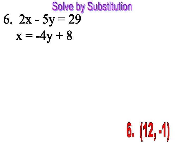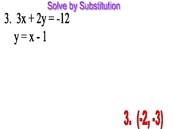 Steps 1. 2. 3. 4. 5. One equation will have either x or y by itself, or can be solved for x or y easily. Substitute the expression from Step 1 into the other equation and solve for the other variable. Substitute the value from Step 2 into the equation from Step 1 and solve. Your solution is the ordered pair formed by x & y. Check the solution in each of the original equations.
