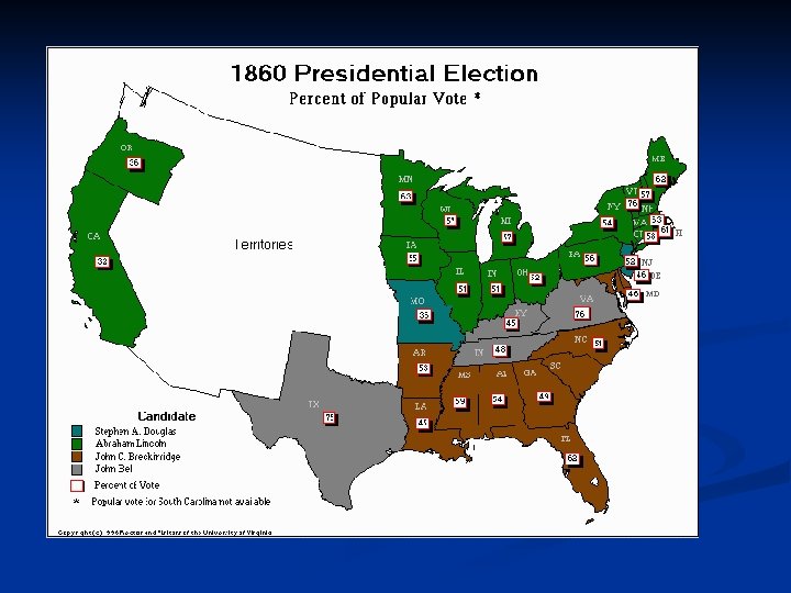 Results: n The North outvotes the South on total electoral college votes and population South Carolina and the South feel threatened n Moves for secession n