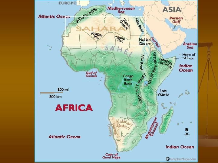 Africa’s Physical Geography n n Surrounding the forests in Africa are bands of savanna – areas of grasslands with scattered trees and bushes. Sahara – desert stretching across most of North Africa. This is the world’s largest desert and it is still growing!.