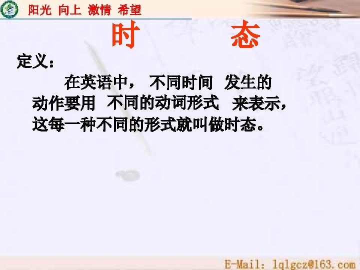 阳光 向上 激情 希望 时态种类 时态例句 一般现在时 I study English every day. 一般过去时 I studied English yesterday. 时态结构 do / does did 一般将来时 I will study English tomorrow. will/be going to do 现在进行时 I am studying English now. am/is/are doing 过去进行时 I was studying English at. . . was/were doing have 现在完成时 I have studied English for six … / has done