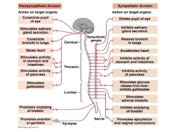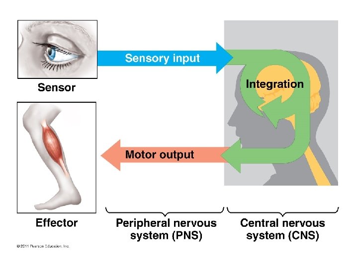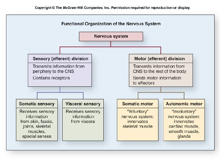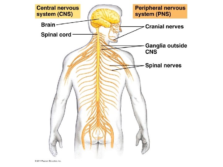 Organization of the Nervous System Central nervous system (CNS) = brain + spinal cord Peripheral nervous system (PNS) = nerves throughout body Sensory receptors: collect info Sensory neurons: body CNS Motor neurons: CNS body (muscles, glands) Interneurons: connect sensory & motor neurons Nerves = bundles of neurons Contains motor neurons +/or sensory neurons