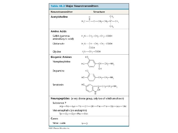 Neurotransmitters Chemicals released from vesicles by exocytosis into synaptic cleft Diffuse across synapse Bind to receptors on neurons, muscle cells, or gland cells Broken down by enzymes or taken back up into surrounding cells Types of neurotransmitters: Excitatory: speed up impulses by causing depolarization of postsynaptic membrane Inhibitory: slow impulses by causing hyperpolarization of postsynaptic membrane