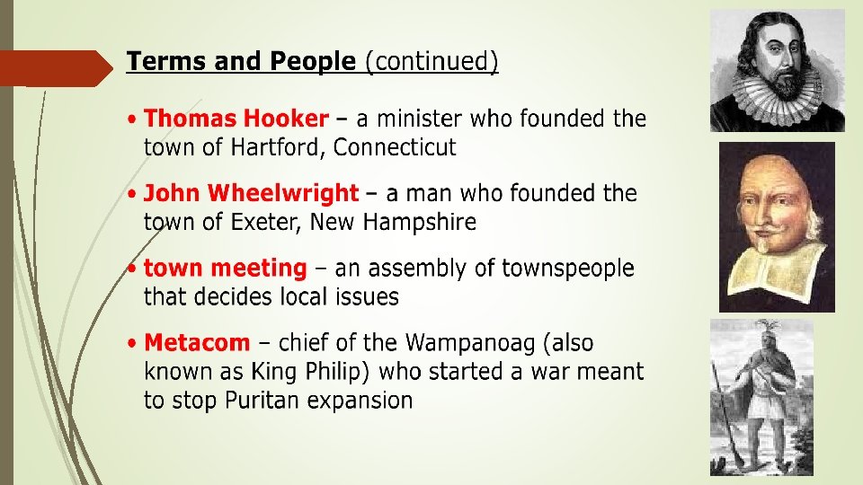 Terms and People • John Winthrop – leader of the Puritans who founded the Massachusetts Bay Colony • toleration – recognition that other people have the right to different opinions • Roger Williams – a minister who founded the town of Providence, Rhode Island • Anne Hutchinson – a Boston woman who established a settlement on an island that is part of present-day Rhode Island