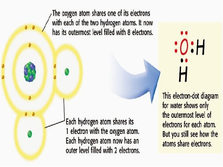 Covalent Bonds and Molecules • Substances containing covalent bonds consist of individual particles called molecules. A molecule usually consists of two or more atoms joined in a definite ratio. A water molecule is shown on the slide after next. • These bonds generally form between nonmetals, where it takes too much energy to transfer electrons so the atoms just share electrons.
