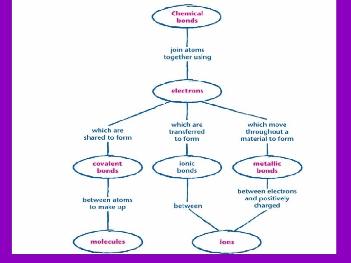 • Ionic, covalent, and metallic • In an ionic bond electrons are gained and lost (In table salt-sodium gives to chlorine so that chlorine can have a full set), In covalent bonds electrons are shared (water- 2 Hydrogen and one oxygen share so that they all have a full set), metallic contain positive ions that are attracted to the electrons of neighboring atoms allowing them to overlap (valence electrons can move from atom to atom, which allows electrical conductivity). • animation of ionic and covalent bonds