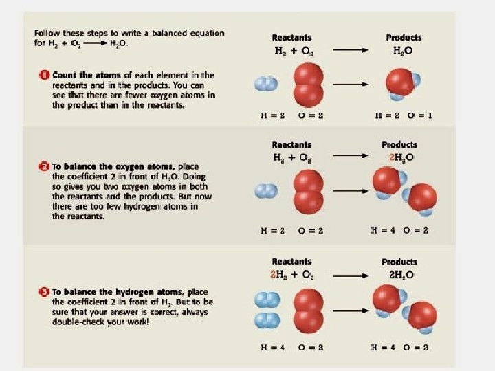 What is a balanced equation? – Each side of the chemical equation (reactants and products) must contain the same # of each type of atom. (of course the bonds will be rearranged after a reaction occurs-new substances are formed) 2 Li. OH+H 3 PO 4→Li 2 HPO 4+2 H 2 O