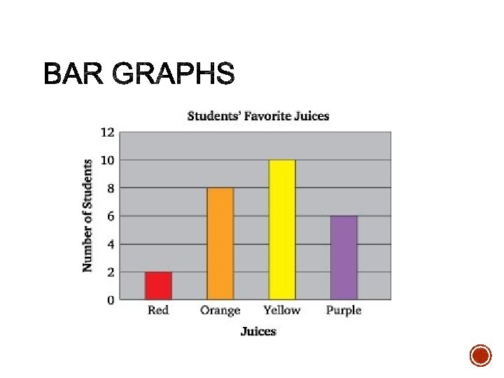 § data point magnitude on y-axis represented as vertical bar/line § Used for plotting non-continuous data, or continuous data with few data points, on x-axis, such as ice cream flavors, brands of shoes, color of light, seasons of year § Sometimes a bar graph or a line graph could be used to represent the same data