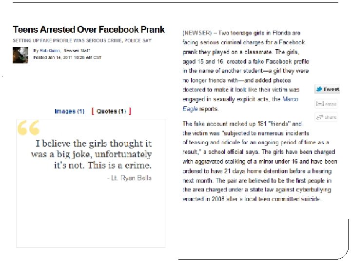 Dangers of facebook/any social media � Facebook posts can have legal reprocussions �In any criminal case (DUI, battery, etc. ), attorneys will research all parties involved �Anything you write and any picture you post is public information and can be used against you � Facebook pictures can lead to child pornography charges �Posting or sending photos of anyone under 18, including yourself, in sexually suggestive poses or wearing sexually suggestive clothing (or no clothing) is considered child pornography �Recipients of the photos, and those that repost them, can also be charged with child pornography