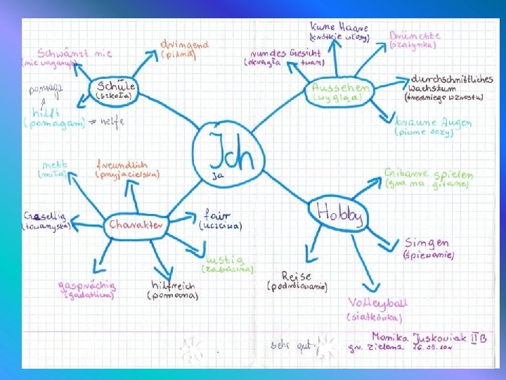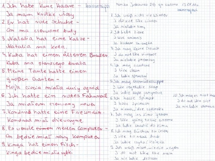 Antwort - Odpowiedzi • Mein Vorname ist Monika – mam na imię Monika • Ich heisse Juskowiak – nazywam się Juskowiak • Ich wohne in Gliwice – mieszkam w Gliwicach • Ich wurde am 24. Mai 1996 geboren – urodziłam się 24 maja w 1996 roku • Ich bin fuenfzehn Jahre alt – mam 15 lat • Am meisten interessiere ich mich fuer das Volleyballspiel – najbardziej interesuje mnie siatkówka • Meine beliebteste Sportart ist Schlittschuhlaufen – moim ulubionym sportem jest łyżwiarstwo • Jetzt studiere ich auf derm Gymnasium. – teraz uczę się w gimnazjum • Ich interessiere mich fuers Singen und Musik. – interesuję się śpiewem i muzyką • Ich habe Kopfschmerzen. – mam bóle głowy