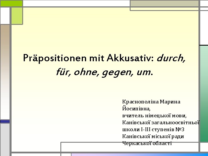 Was soll man über Präpositionen wissen: Wörter wie die folgenden werden Präpositionen genannt: durch, für, ohne, gegen, um usw. Präpositionen verbinden Wörter und Wortgruppen miteinander. Folgende Präpositionen fordern den Akkusativ: □ bis; □ durch; Singular Plural □ für; Kasus Maskulinu Femininu Neutrum □ gegen; m m Nom. der das die □ ohne; Akk. den das die □ um; □ entlang.