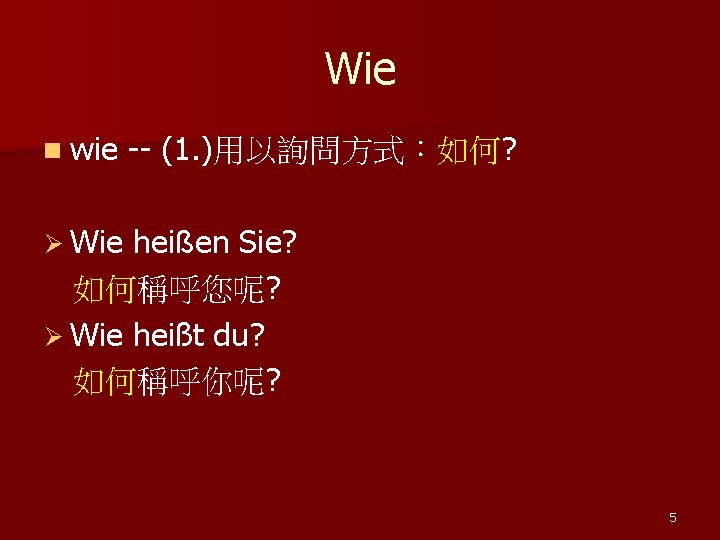 Was Ø Was hat er gesagt? 他說了什麼? Ø Was sind Sie von Beruf? 您的職業是什麼? Ø Was machen Sie hier? 您在這裡做什麼? 4