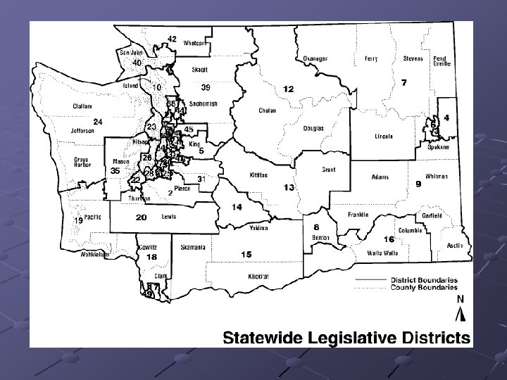 Who are these representatives? Ø Washington State has 49 legislative districts. Voters in each district elect one Senator and two representatives to the House. Ø Senators serve four year terms while members of the House of Representatives have two year terms. Ø To run for office, a person must be a U. S. citizen, a qualified voter and a resident of the district they represent.