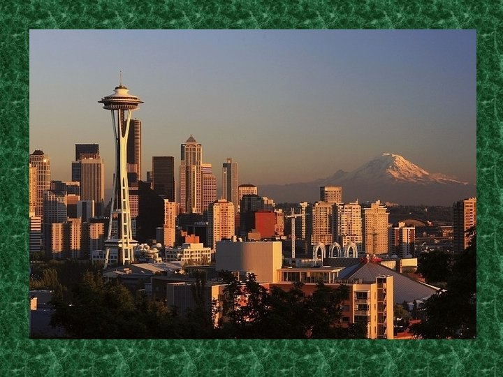 Seattle • My City! • Located between Puget Sound and Lake Washington • About 160 km South of the Canadian Border and about 225 km South of Vancouver B. C. • 15 th Largest Metropolitan Area in the U. S.