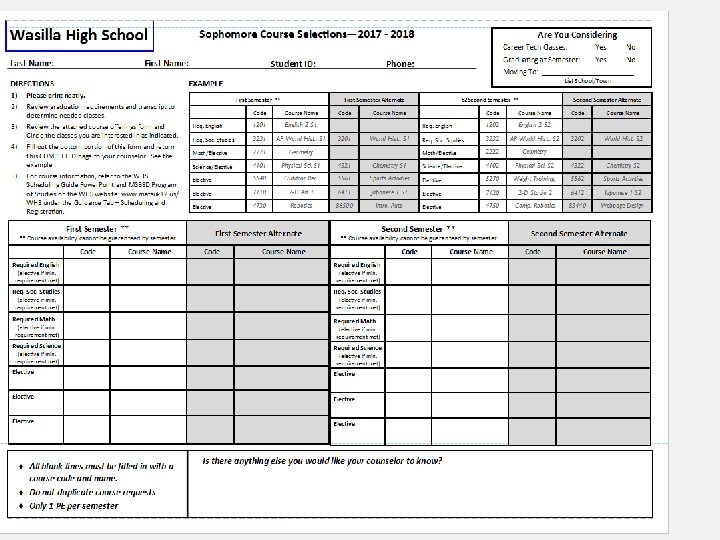 Submitting Course Requests q Please print neatly – Don’t forget your name: q Review graduation requirements and transcript to determine needed classes. q Review the attached course offerings form and Circle the classes you are interested in. Fill out the bottom portion of this form. q Enter classes into computer. https: //icue. matsuk 12. us/toas/sr_tsis_login. asp q Turn in COMPLETED page to your counselor. See the example. q For course information, refer to the WHS Scheduling Guide Power. Point and MSBSD Program of Studies on the WHS website: www. matsuk 12. us/WHS under the Guidance Tab – 2017 -2018 Scheduling. http: //www. matsuk 12. us/cms/lib/AK 01000953/Centricity/shared/msbsd_for ms/education%20 and%20 instruction/HS%20 Program%20 of%20 Studies. pdf