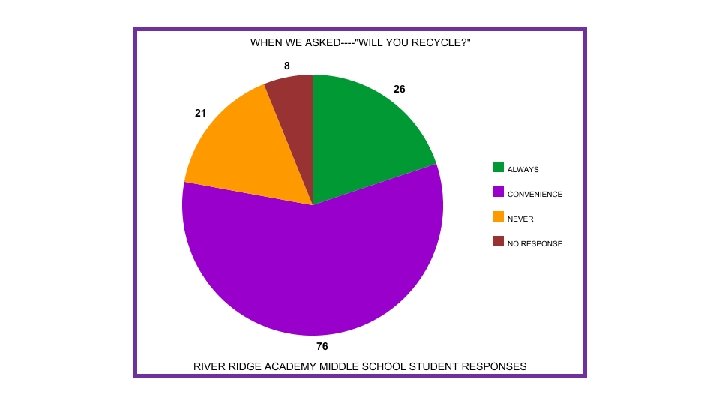 CONCLUSION At the conclusion of this experiment it was obvious that the recycling centers placed in the middle school classrooms increased plastic recycling. As a result of the “Awareness Campaign” students began to understand that while recycling was important it was equally important for them to begin using reusable water bottles and refill them at the water fountain refill stations. This was evident from the number of plastic waters/containers collected from the classroom recycling centers and from the increase of usage at the water fountain refill stations. Community involvement had an impact as well. Having Beaufort County and Publix as partners strengthened the project’s credibility both inside of River Ridge Academy and outside. An example of this was the Bluffton Sun accepting an invitation to come to RRA and interview the teams about the research, experiments and findings of the projects. As the recycling “Awareness Program” continues at RRA, the data collected will need to be recorded per recycling center collection to include the date and location. This way success can be recorded and specifically measured for each part of the school. In turn, data collected will need to be recorded per water fountain refill station to include date and location. This way success of this part of the experiment can be recorded and specifically measured for each part of the school. As the “Awareness Program” grows outside of RRA’s walls it will be interesting to see how it will effect the community of Bluffton and beyond. While recycling is a way for RRA to help the planet and reduce the amount of trash that is placed in the landfills, it is more important to get students to reduce the amount of plastic water bottles used in total. Replacing these with reusable water bottles and refilling them in the water fountain refill stations is a better option for the school and for the environment. The key to truly protecting the planet is for RRA’s students, staff, families and communities to “reduce” the amount of