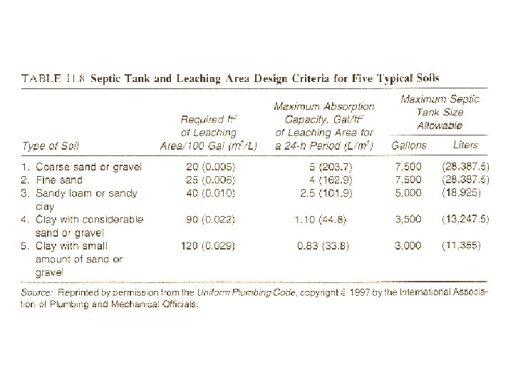 Sizing a seepage pit l l l l Sized by determining the required leaching area Leaching area is the pit surface (wall area of the pit) required for seepage of effluent from the septic tank Wall area of a circular pit = * diameter of the pit * depth of the pit Assume an office building with 20 employees Daily sewage from the building = 20*20 = 400 gallons Minimum surface area required for seepage (assuming sandy loam soil condition): 40 sq. ft. /100 gallons Required pit surface for 400 gallons = 400*40/100 = 160 sq. ft. Assuming the diameter of the pit to be 6 ft. , depth of the pit = 160/( *6) = 8. 5 ft.