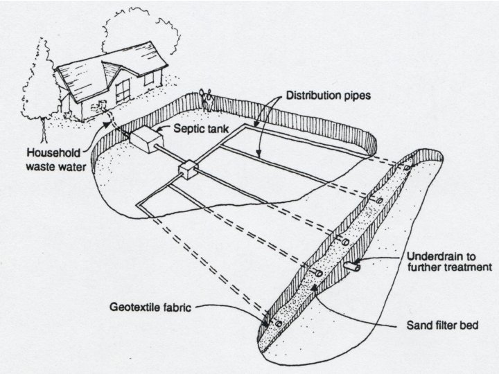 Septic tank systems l Construction of septic systems – Septic tank l l Provides primary treatment of waste through sedimentation Aerobic decomposition of sediments – Aerobic bacteria survives in the presence of oxygen – Seepage pit l Provides secondary treatment of waste through leaching or filtration – Drainfield l l Provides secondary treatment of waste through leaching or filtration Percolation test
