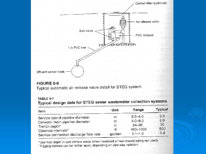 Septic Tank Effluent Gravity STEG Small diameter plastic pipe Ø Conveys effluent from a septic tank Ø l with an effluent filter No solids to transport (no minimum velocity required) Ø Can be installed at variable (flat) grades Ø No manholes Ø Air-release valves needed at high points Ø
