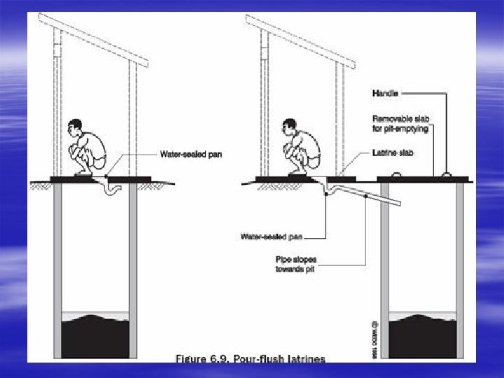Control Method 1)Trench Latrine Trench latrine is a rectangular hole in the ground. The hole should be dug as deep as possible, around 2 m. The length usually between 5 and 10 m, and 1 to 1. 5 m width. There are pair of wooden boards for the users to squat. There is a gap between the boards through which the users excrete.
