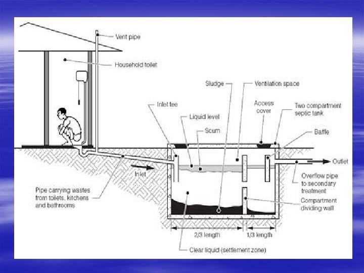 4. Septic Tank § A septic tank is a rectangular chamber. § Made with RCC or brick work plastered with a water proof cement sand mortar usually built underground. § It is designed to remove solids prior to the effluent proceeding to the soil absorption area, provide for the digestion of a portion of those solids, and store the remaining solids. § Septic tank should be pumped and inspected every 1 to 3 years. § The frequency of pumping depends on several factors: ü Capacity of septic tank ü Volume of wastewater (related to size of household) ü Amount of solids in the wastewater (i. e. garbage disposals produce more solids)