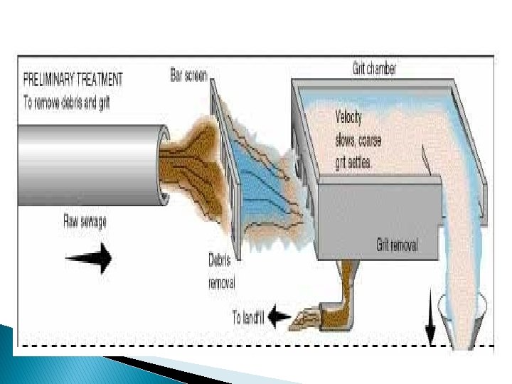 The objective of primary treatment is the removal of settable organic and inorganic solids by sedimentation, and by removal of materials that will float (scum) by skimming. In conventional wastewater treatment facilities, primary treatment includes: 1. Screening and comminuting for removal of large solids 2. Grit removal 3. Sedimentation