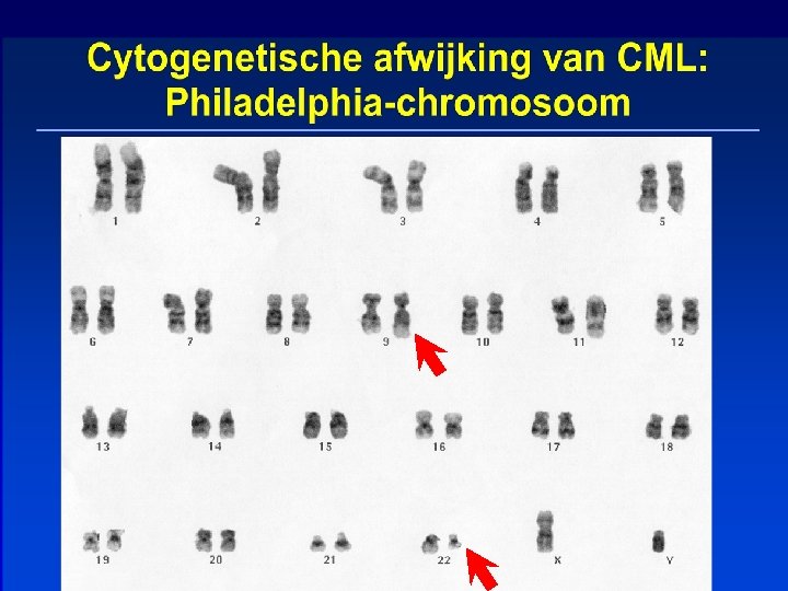 CML heeft een zeer karakteristieke chromosomale afwijking Deze afwijking ontstaat in de hematopoetische stamcel De afwijking is in de rijpe cellen ook aantoonbaar m. b. v PCRtechnieken umcg Afdeling Hematologie