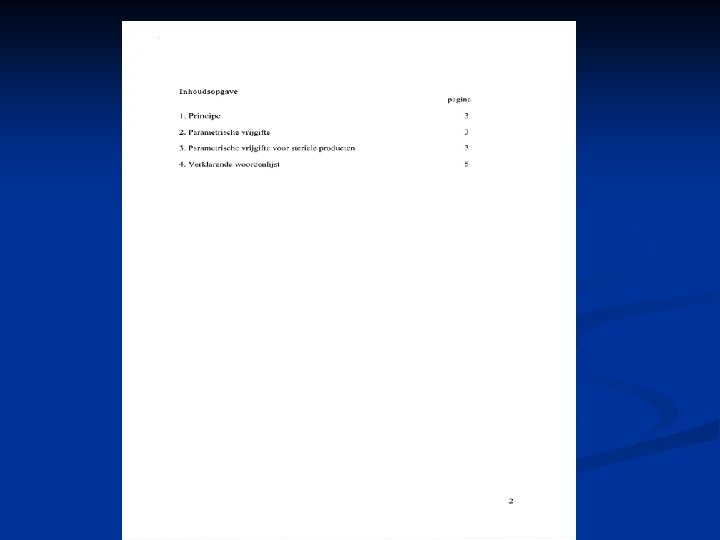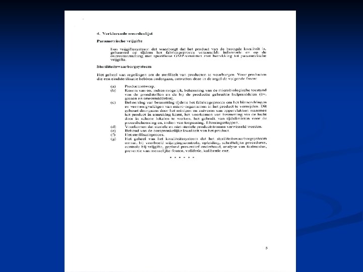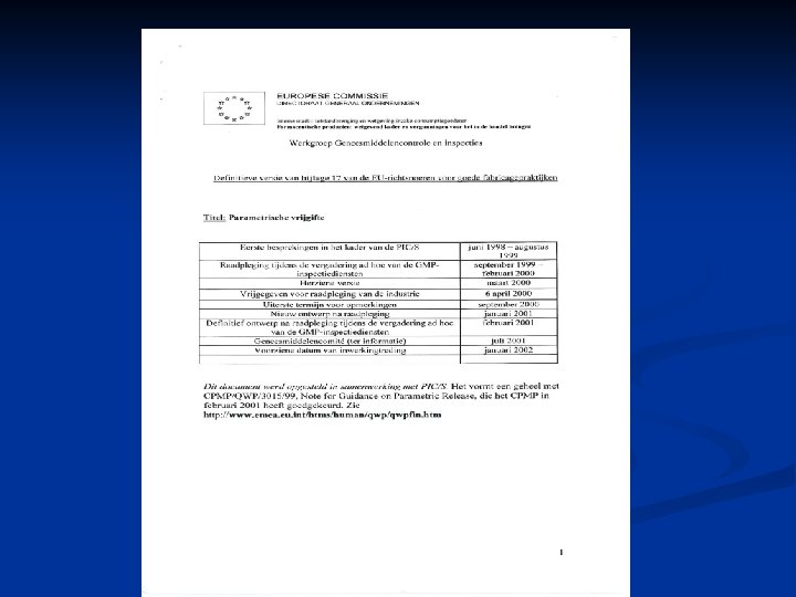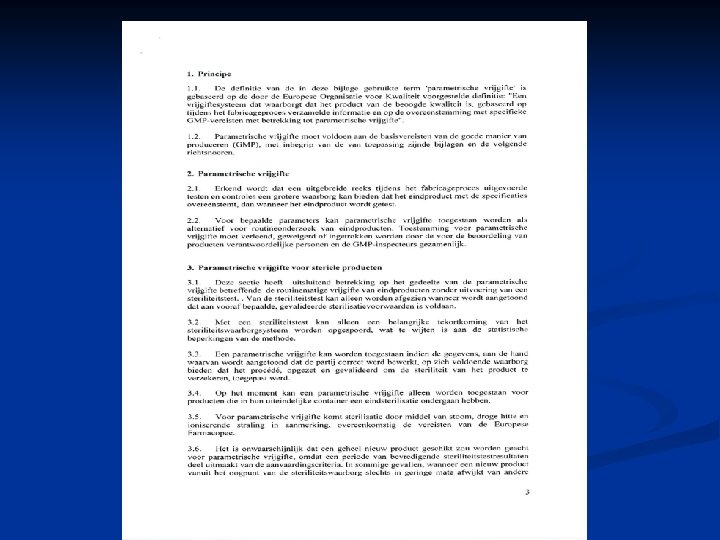 n n Voor vrijgifte van producten op basis van procesparameters moet verificatie plaatsvinden van eerdergenoemde parameters door een ter zake deskundig persoon, die daartoe is aangewezen De gedocumenteerde resultaten van ieder proces dienen te worden getoetst aan die van de validatie Aantoonbare beheersing van het gehele productieproces in al zijn facetten is van belang Resultaten van zelfinspectie vormen een onmisbaar instrument