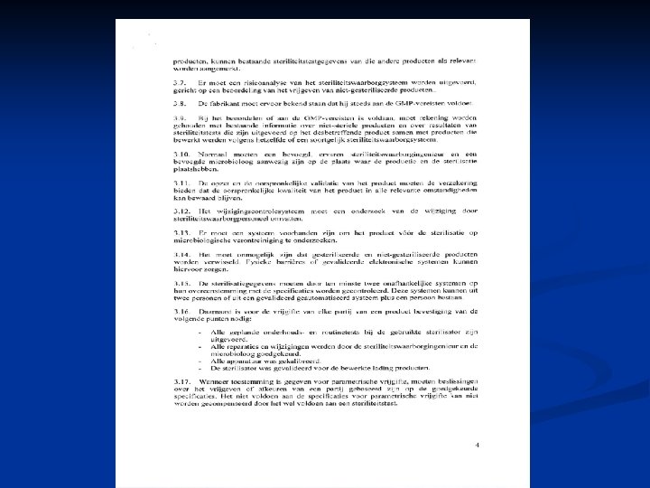 Wat is GMP? Good Manufacturing Practice ( goede wijze van produceren) n De kwaliteit van een product wordt vastgesteld door, het hele productieproces ( dus alle facetten van het proces ) op een nauwkeurige en voorgeschreven manier uit te voeren n Met betrekking tot steriliteit richten deze normen zich op: n