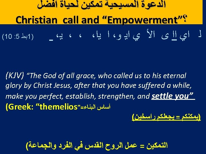 The Story of Salvation. . a story of re-empowerment ﻗﺼﺔ ﺍﻟﺨﻼﺹ ﻫﻲ ﻗﺼﺔ ﺗﻤﻜﻴﻦ “God blessed them; and God said to them, "Be fruitful and multiply, and fill the earth, and subdue it; and rule over the fish of the sea and over the birds of the sky and over every living that moves on the earth. “(Genesis 1: 26 -28) ﺛﺭﻭﺍ ﻭﺃﻜﻭﺍ ﻭﺍﻣﻭﺍ ﺍﻷ ﻭﺧﻭﺍ ﻭﻃﻮﺍ ﻋﻠﻲ ﺍﻟﺣ ﻭﻋﻠﻲ ﻳ ﺍﻟ ﻣﺎ ﻭﻋﻠﻲ ﻭﺍ ﻋﻠﻲ. . ﻭﺑﺎ ﺍﻟﻠ ﻭﻗﺎﻝ ﻟ. . . ”. (28 - 26: 1 ﺍﻷﺮ“)ﺗﻚ To Adam he said, "Because you. . ate from the tree about which I commanded you, 'You must not eat of it, ' "Cursed is the ground because of you; through painful toil you will eat of it all the days of your life. (3: 17 )ﺗﻚ. ﺍﻟ ﺍ ﺍ ﺍ. ﻻ ﺍ ﺍ ﻭ ﺍﻻ : » ﻻ ﺍﺍ ﺍ ﺍﻟ ﺍﻱ ﺍ ﺍﻻ : ﺍ ﺍ 8