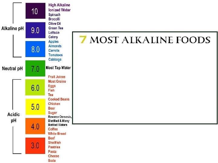 To Maintain Good Health a Diet many Recommend is: ~ 60% Alkaline Forming Foods ~ 40% Acid Forming Foods Strongly Acidic p. H 4. 0 Mildly Acidic p. H 4. 5 to 6. 5 Neutral p. H 7. 0 White Bread, Processed Cheese Alcohol, Beers Sodas, Tea, Coffee Sugar, French Fries Peanuts, Walnuts Meat and Fish, Canned Fruits De-ionized Water Many Fruits, Coconut Legumes Most Nuts Egg Yolks Raw Milk Brown Rice Basmati Rice Artificial Sweeteners Dairy, Cocoa Raw Cream, Whey Most Vegetables Asparagus, Garlic Almonds Cayenne Pepper Cucumber Avocados Raw Spinach Kale Quinoa, Kelp, Celery, Buckwheat Broccoli Falx Seed Raw Swiss Chard Olive oil Cooked Spinach Raw Honey Mildly Alkaline p. H 7. 5 to 9. 5 Strongly Alkaline p. H 10. 0 Melon, Raisins, Vegetable Juices