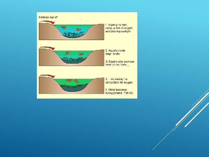 EUTROPHICATION OF LAKES Eutrophication: nutrient enrichment of lakes mostly from runoff of plant nutrients (nitrates and phosphates). During hot dry weather can lead to algae blooms Decrease of photosynthesis Dying algae then drops DO levels Fish kills, bad odor