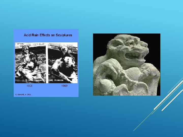 Acid rain dissolves the stonework and mortar of buildings (especially those made out of sandstone or limestone). It reacts with the minerals in the stone to form a powdery substance that can be washed away by rain. BUILDINGS