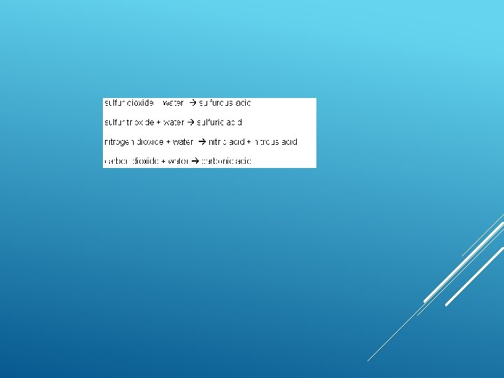 CAUSES OF ACID RAIN Burning coal, Oil and natural gas in power stations makes electricity, giving off sulphur dioxide gas. Burning petrol and oil in vehicle engines gives off nitrogen oxides as gases. These gases mix with water vapour and rainwater in the atmosphere producing weak solutions of sulphuric and nitric acids – which fall as acid rain.
