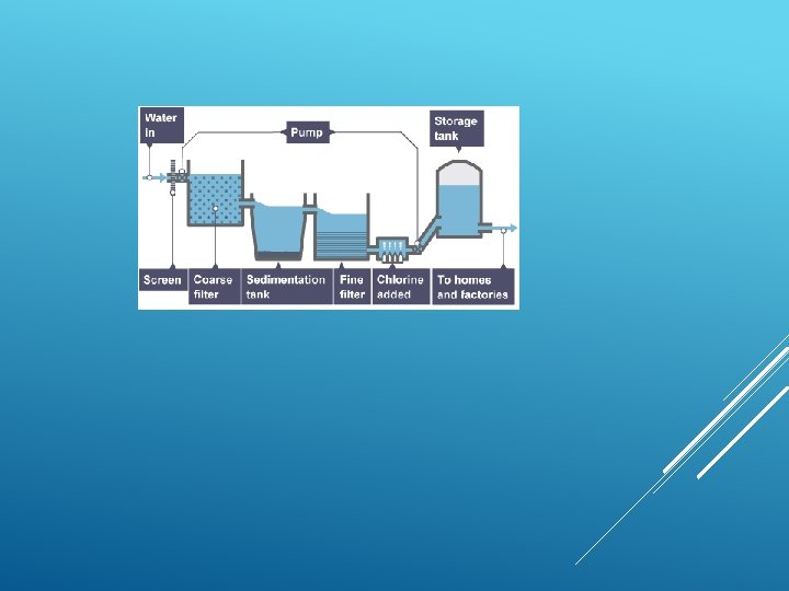 Purification of water involves physical, biological and chemical processes such as: 1. Filtration 2. Chlorination 3. Boiling 4. Use of potash Alum 5. Distillation PURIFICATION OF WATER