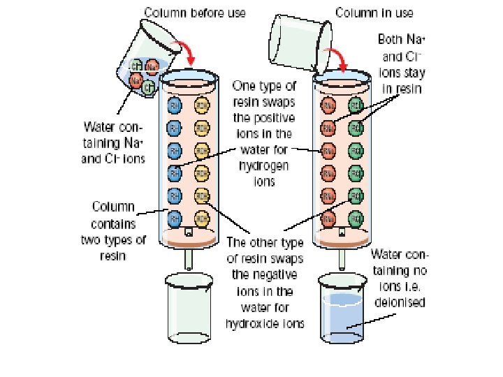 Deionised water � To make deionised water it must be passed over a mixed bed resin (cation and anion resin) � RH (cation) + Na+ = RNa + H+ � ROH (anion) + CL- = RCL + OH� H+ + OH- = H 2 O � Only ions removed so product not as pure as distillation