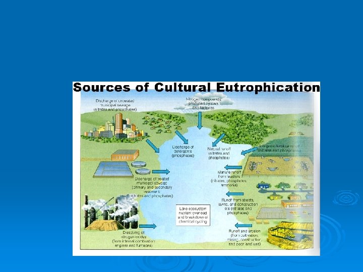 Pollution Many causes of pollution including sewage and fertilizers contain nutrients such as nitrates and phosphates. Ø In excess levels, nutrients over stimulate the growth of aquatic plants and algae. Ø Excessive growth uses up dissolved oxygen as algae decompose, and block light to deeper waters. Ø Ø Ø Video- Restricted waters 6 min