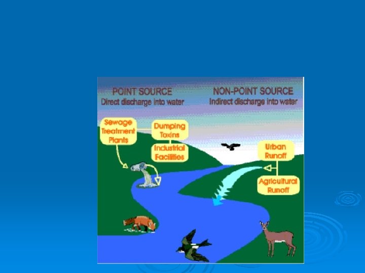 Non point source pollution Ø Non point source pollution is not from a specific source. Ø Instead it comes from a variety of sources. Ø Cannot be traced back to 1 specific spot. Ø Much more difficult to control. Ø Accounts for a majority of the contaminants in streams and lakes. Ex- Farm runoff(Herbicide, pesticide, fertilizer) l Road runoff (oil, gasoline, antifreeze,