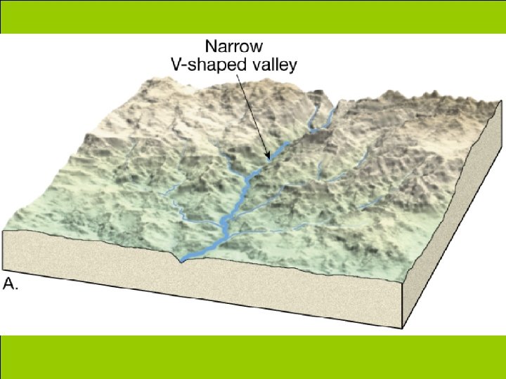 Running water p. Stream valleys are the most common landforms on Earth’s surface p. Types of stream valleys §Narrow valleys V-shaped § Downcutting toward base level § Features often include rapids and waterfalls §