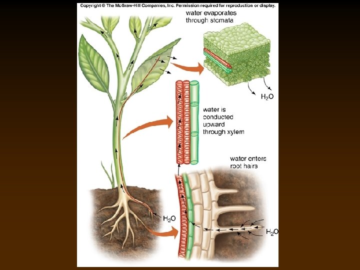 Regulation of Transpiration • If a cool night follows a warm, humid day, water droplets may be produced through hydathodes at the tips of veins of some plants (Guttation). Copyright © Mc. Graw-Hill Companies Permission Required for Reproduction or Display