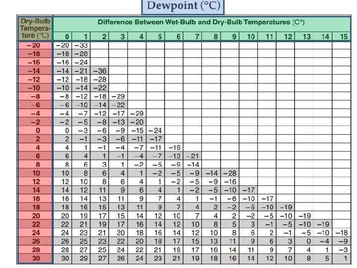 Question: If the dry-bulb temperature is 24 o C and the dewpoint is 2 o C, what is the wet-bulb temperature? Dry-Bulb ∆ W-B & D-B Web-Bulb - 24 o C 11 o C 13 o C